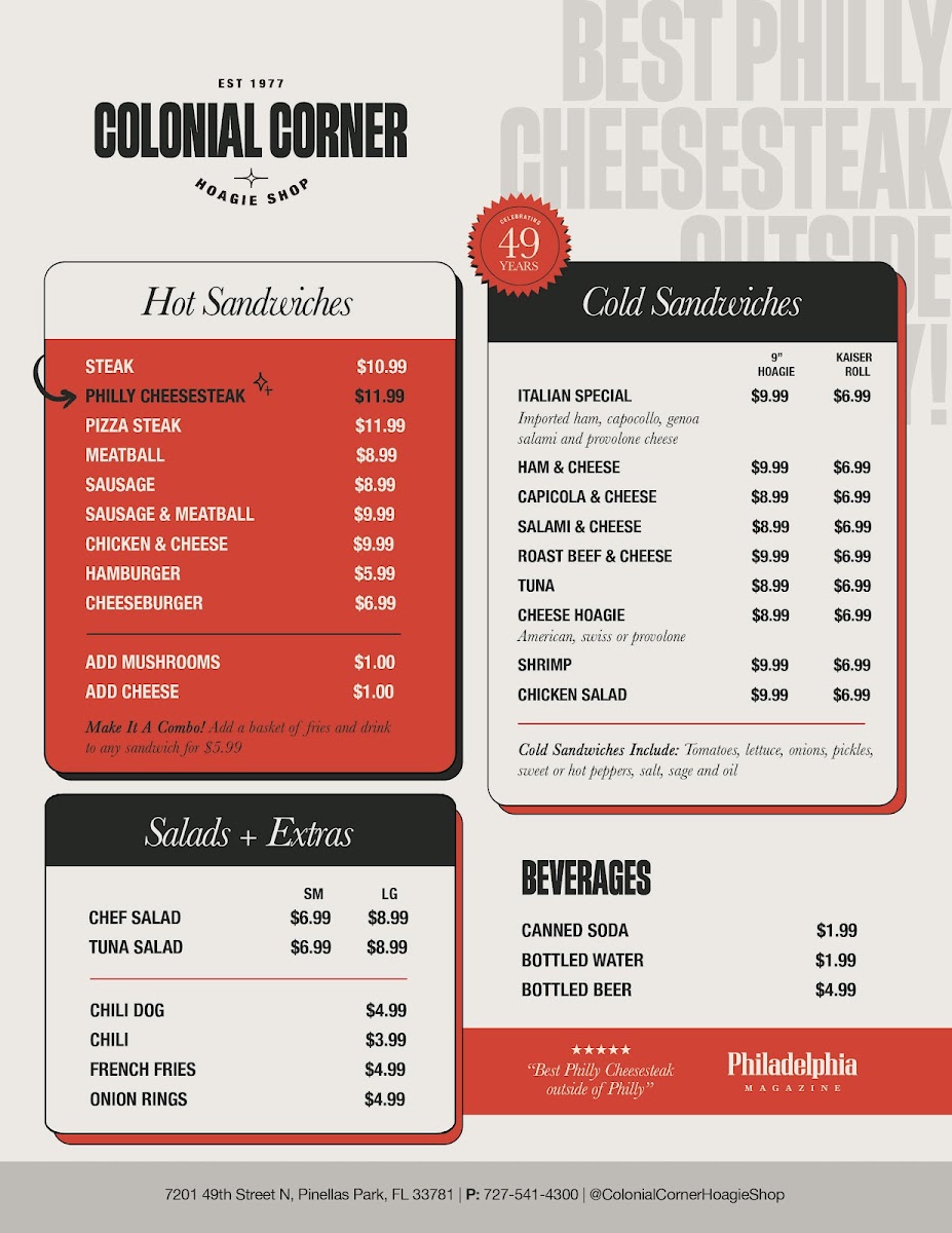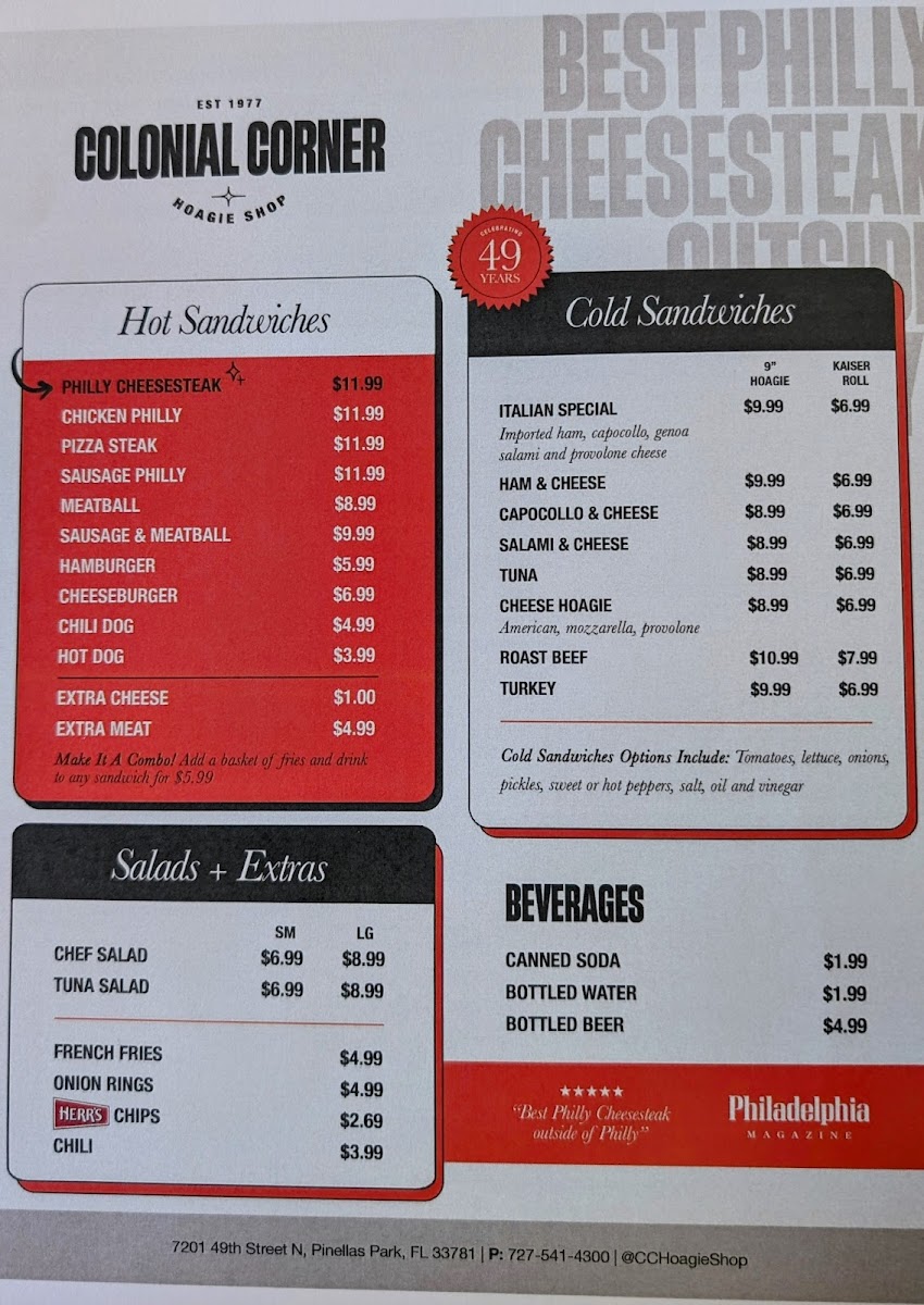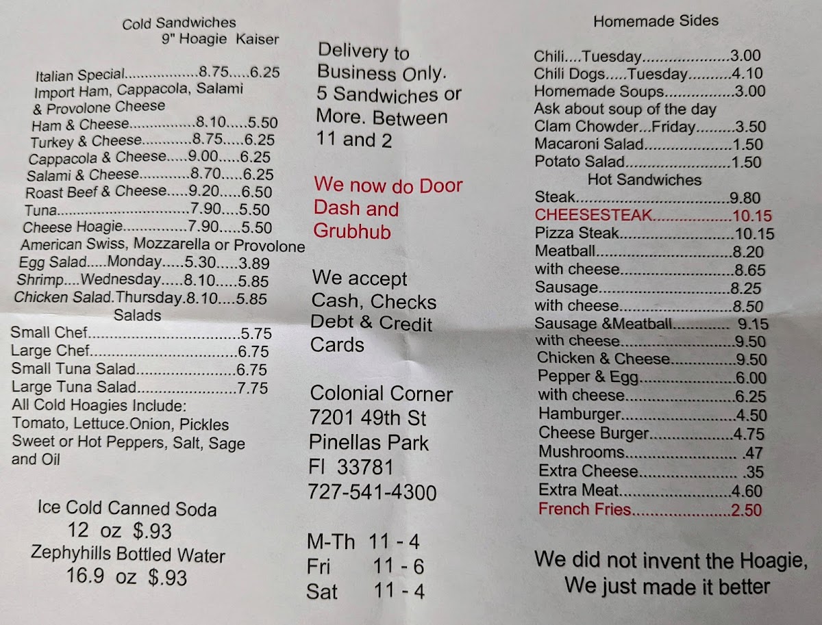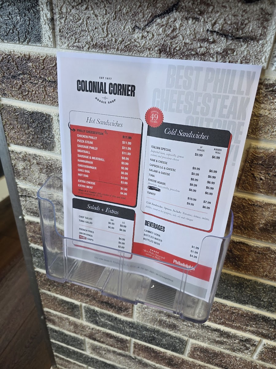 The menu at Colonial Corner Hoagie Shop offers a straightforward and satisfying selection of classic sandwiches and fast food favorites, ideal for a casual meal on the go or a laid-back lunch break. You’ll find hearty hoagies and cheesesteak sandwiches made with fresh, quality ingredients that pair well with comforting sides like crispy French fries and golden onion rings.